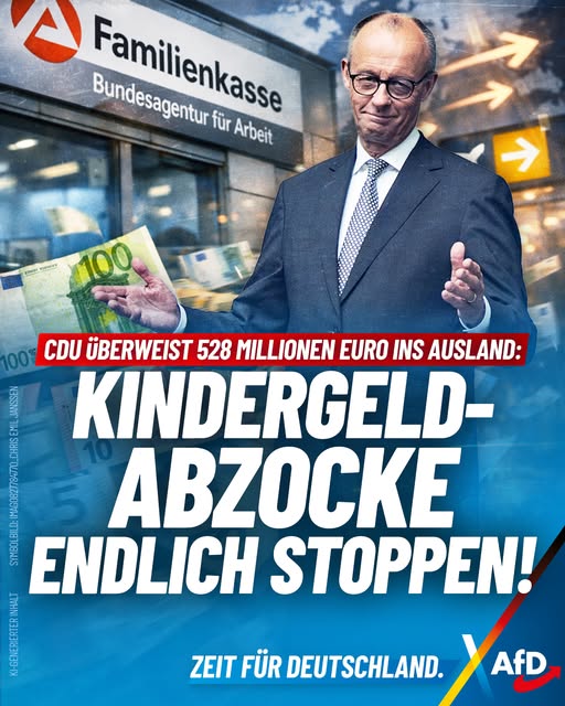 528 Millionen Euro Kindergeld überwies die CDU-Regierung im Jahr 2025 auf ausländische Konten. Die Zahlen der Bundesagentur für Arbeit belegen das ganze Ausmaß des Versagens: Seit 2010 haben sich diese Zahlungen fast verfünfzehnfacht, wobei allein Ukrainer bereits auf Platz 3 der Empfängerliste stehen. Insgesamt fließen über 22 Prozent des Kindergeldes an Familien mit ausländischer Staatsangehörigkeit. Damit setzt die Union den Kurs der grenzenlosen Selbstbedienung fort und lässt zu, dass unsere Sozialsysteme zum Magneten für Armutsmigration aus aller Welt werden.